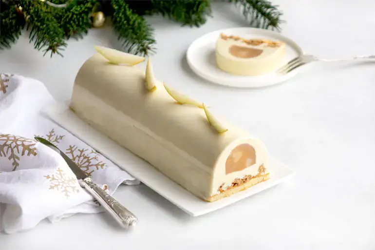 Pour cette bûche j'ai associé un biscuit Madeleine aux poires, d'une compotée de poires, jus citron, fruit frais, croustillant praliné et une mousse au chocolat blanc vanille et d'un glaçage ou flocage.